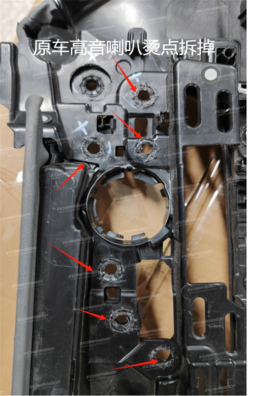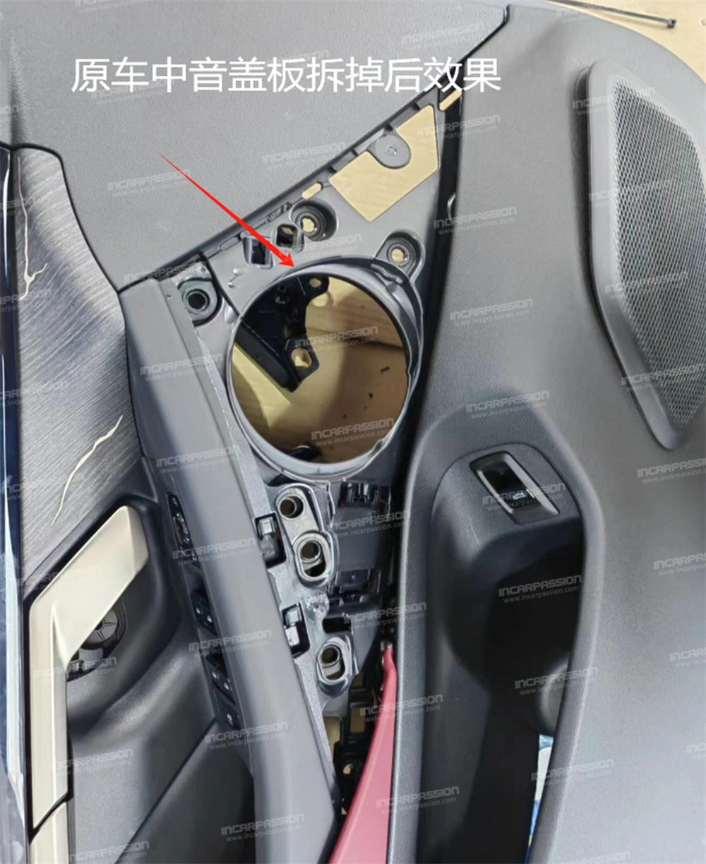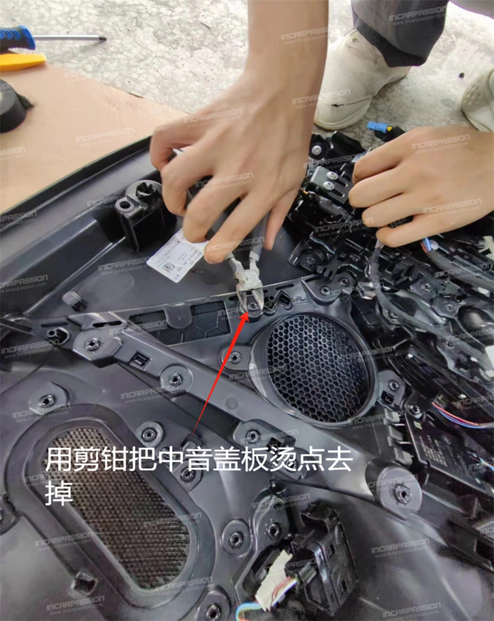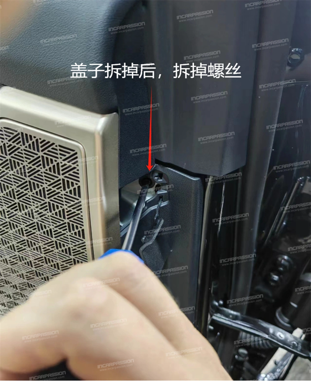 10. After removing the door panel, remove the heat – staked points of the original car’s mid – range speaker cover and take off the mid – range speaker cover.