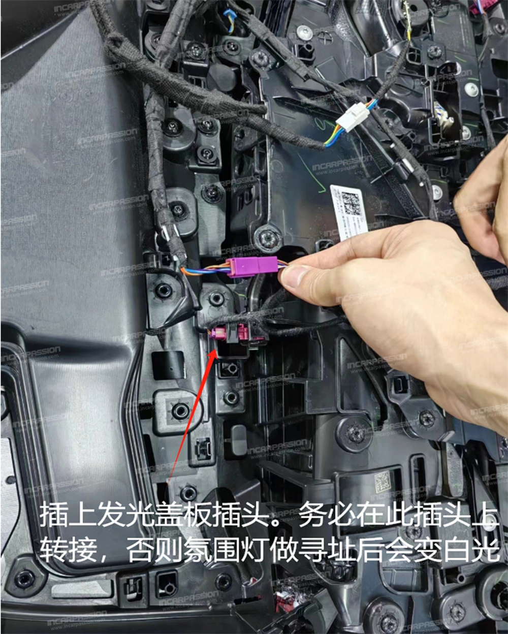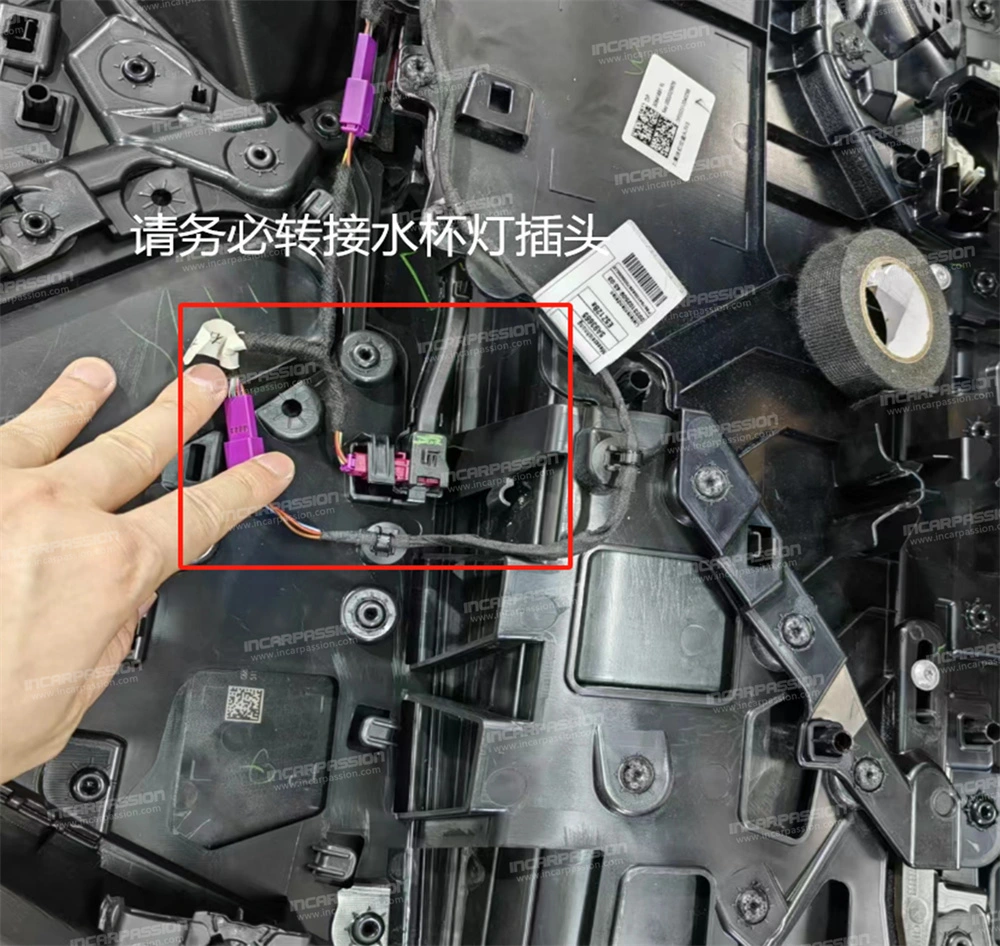19. Plug in the connector of the luminous cover plate. Make sure to make a connection at this connector. Otherwise, the ambient light will turn white after addressing.