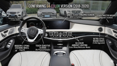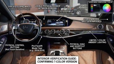 • S-Class W222 (2014–2017): Pre-Facelift models with the NTG 5.0 system and original 7-color ambient lighting.